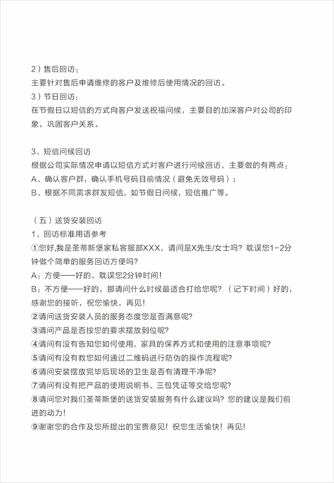 话术参考:“**先生/女士您好,我是九游的售后服务人员**,您购买的九游家具已经全部到货了,送货安装大约需要**时间,请问您这边什么时候方便我们上门送货安装呢?”同时要了解送货小区的电梯、楼道、入户门的尺寸等,提前做好准备,避免意外情况。最后确定送货时间(安装所需要时长),并告知客户安装人员的相关信息,可加微信发送,并发送配送安装流程说明。