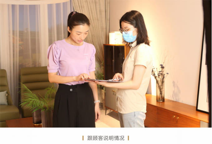 耐心解答客户提出的关于家具保养的提问,同时将九游产品使用说明书送给客户,尔后教客户如何扫描产品二维码进行防伪鉴定,请顾客对货物进行验收检查,然后正式签收《产品配送单》。